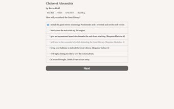 Choice of Alexandria, okuyuculara tamamen metin tabanlı bir etkileşimli roman deneyimi sunan bir oyun. Mac platformunda kullanılabilen bu oyun, 90,000 kelimeden oluşan zengin bir hikaye ile kullanıcıların seçimlerine dayalı olarak ilerliyor. Oyun, grafik veya ses efektleri içermemesiyle dikkat çekiyor ve bu sayede hayal gücünün sınırsız gücünü ön plana çıkarıyor.